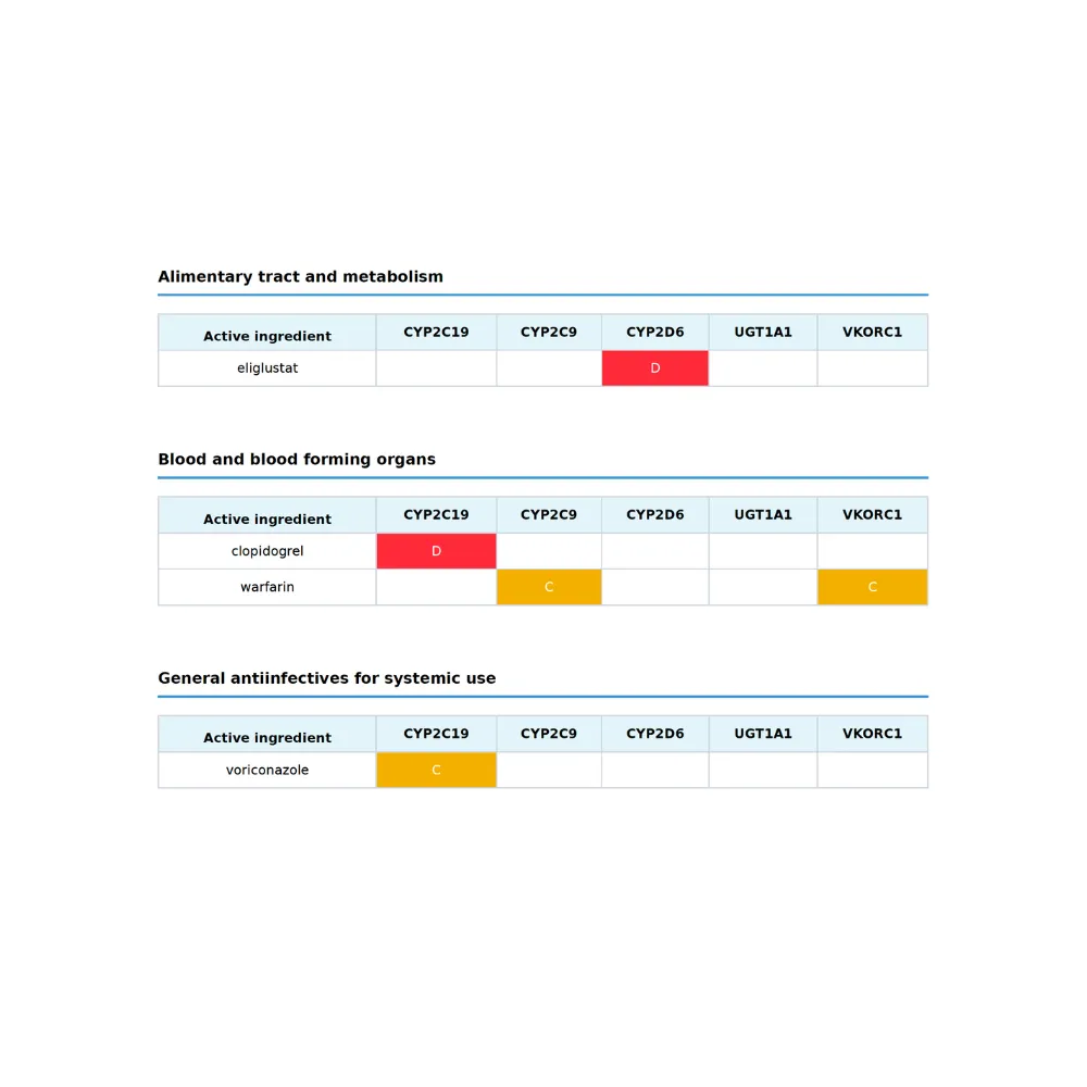 Lääkekohtaiset varoitukset ja suositellut muutokset annostukseen perustuen geneettisiin riskeihin.